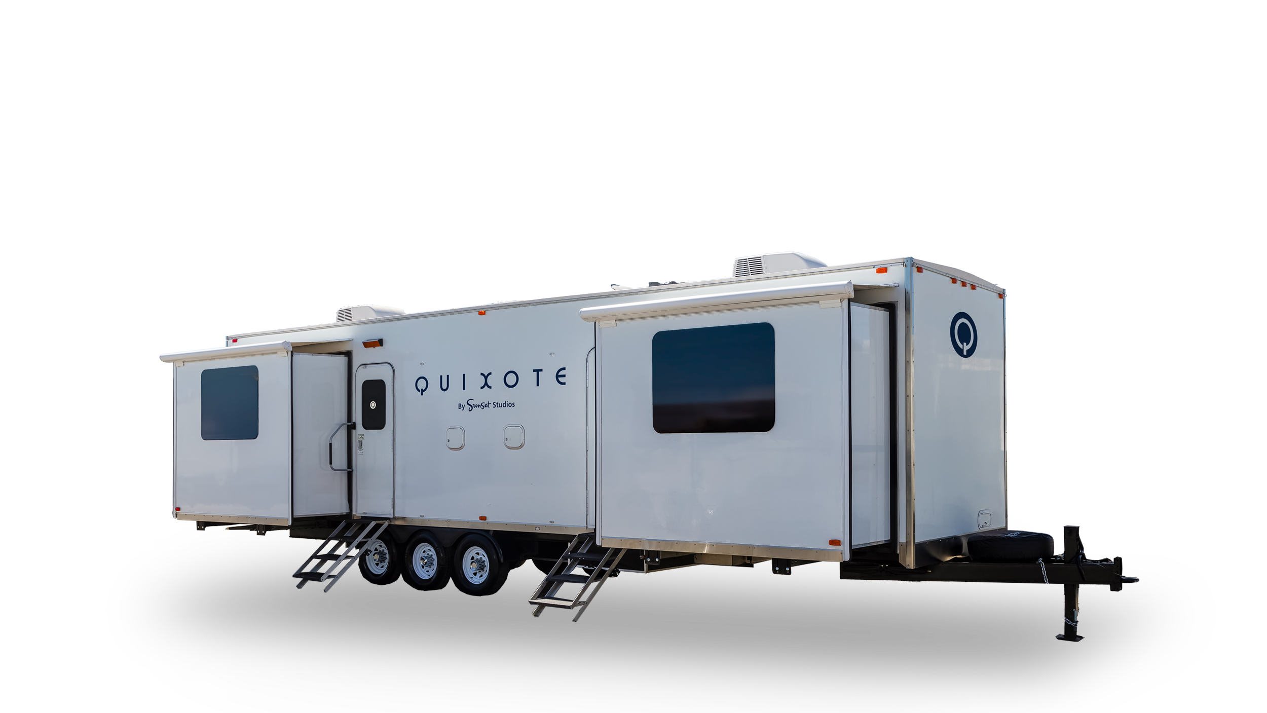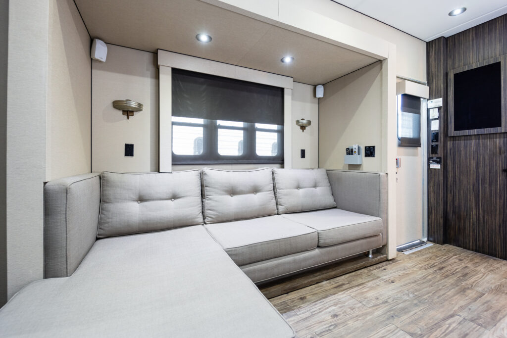 Our Newest Two Room Slide out is the perfect blend of contemporary design and luxurious comfort. Each of the identical rooms have custom L-Shaped sofas with down wrapped cushions nestled into the 36”curbside slide outs. The Corian make up counters are desk height and fitted with a huge LED backlit mirror to make sure your stars are camera ready. We would be remiss if we didn’t mention the top of the line 42” LED TV, equipped with surround sound system, HD Satellite, and Bluetooth compatible connectivity. The Bathroom looks like it was plucked out of luxury hotel with its glassed in shower with porcelain tile, and over counter sink. We can’t be blamed if your cast doesn’t want to leave this perfect on set hide-away.