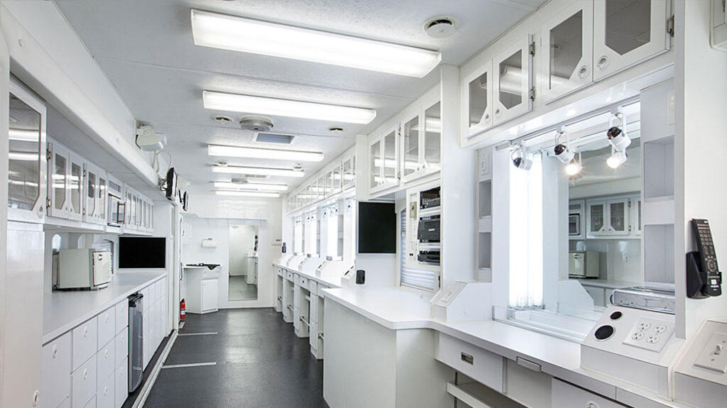 Amenities and functionality abound in this trailer, and roominess is no issue with a 16ft curbside slide-out. This trailer has a 16ft curbside slide-out loaded with cabinets and drawers. The trailer features 6 large make-up stations with airbrush capabilities and hair stations. The all white interior with its 8-foot ceilings provides roominess so necessary when things get busy. Both actors and make-up artists can enjoy 4 20” TV’s, DVD, CD, towel warmer, microwave and refrigerator.