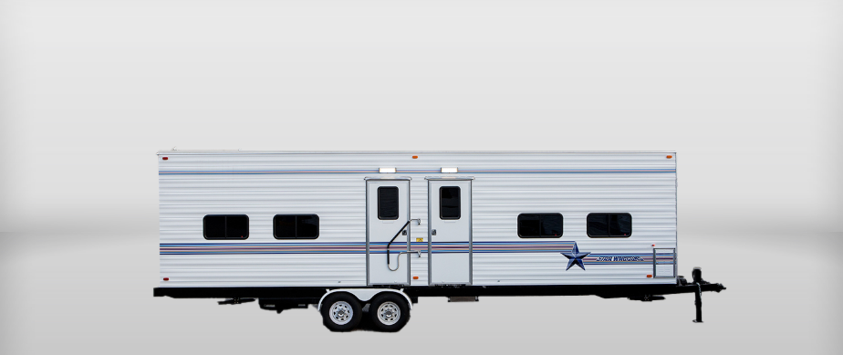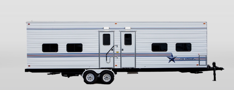 This 38ft production office makes the perfect place to organize the workday. The wide, well lit counters make excellent work stations with file drawers and overheard cabinets. Entry doors at each end of the trailer make it possible to access two rooms then the partition is closed in the center. For additional convenience a microwave, CD stereo, TV and DVD player are also built in.