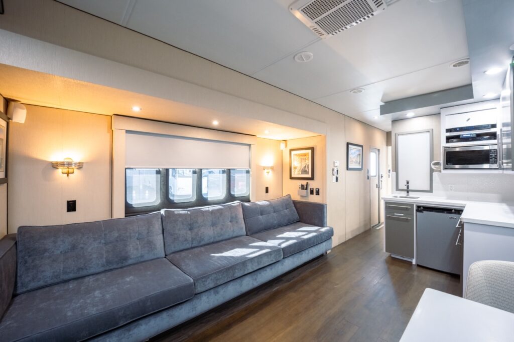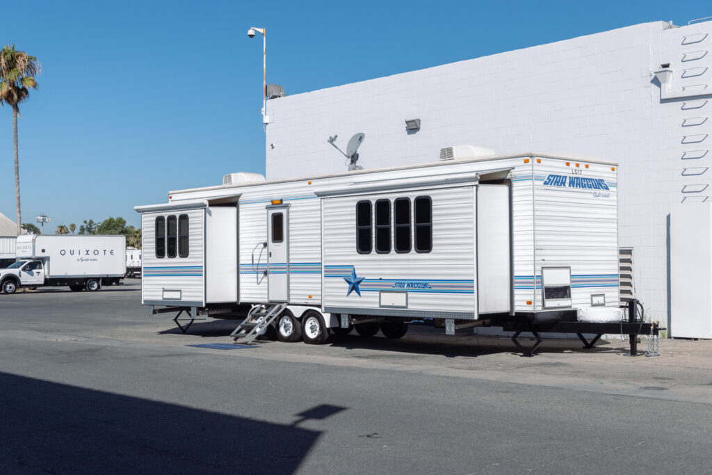 This beautiful new Luxury Suite (LS) will captivate your talent with its sustainable décor, designer amenities, and spacious layout. Your star will be able to prepare his or her best work in this 43 ft. home away from home. This elegant single occupant vehicle with two curbside slide-outs has roominess seldom found in a location cast trailer. The living quarters feature gorgeous design materials, a 15 ft. down wrapped sofa, and a folding meeting table providing ample room for meetings and relaxing. The rear portion of the suite hosts a huge LED make-up mirror above a desk height make-up bar. A Queen sized lounge adds to the comfort. Separate, HD DirecTV Smart satellite, Blu-ray, Bluetooth connectivity and MTX/ Polk Audio surround sound. A tiled glass shower and contemporary fixtures are all part of package in a bathroom that would make luxury hotels jealous.