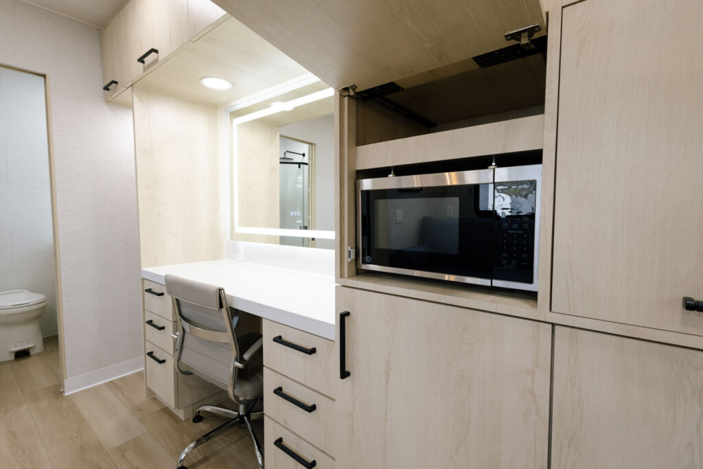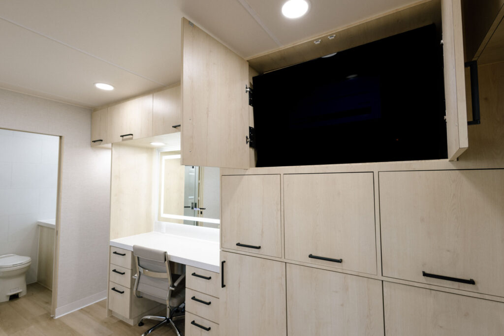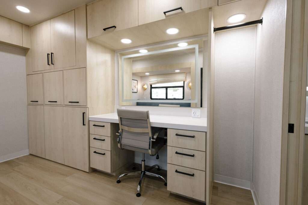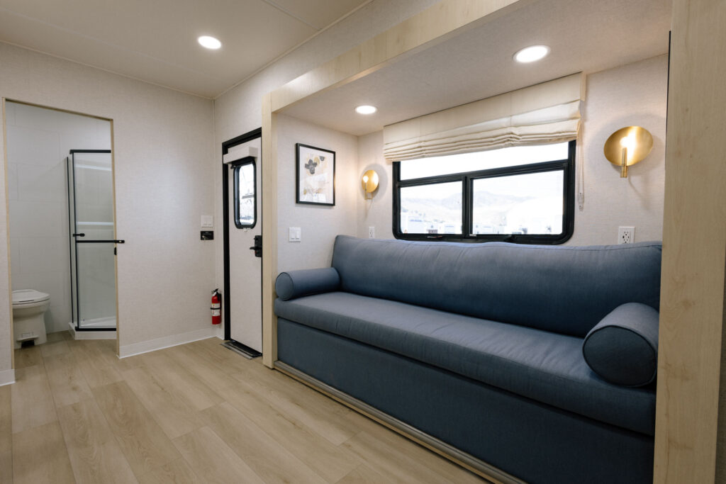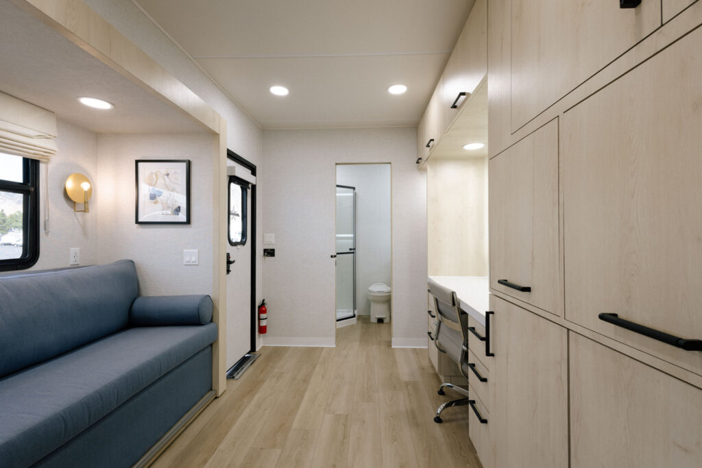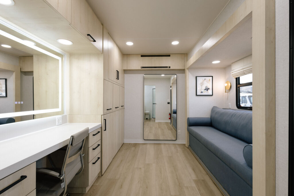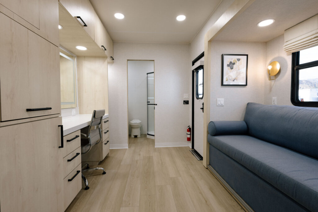 The iconic brand known for providing luxury cast trailers to celebrities and production clients is back with a fully remodeled trailer design. Revamped interiors feature a calming neutral palette, custom blonde mill work, and plush upholstery as well as a full-height refrigerator and electric fireplace. A refreshed exterior profile with smooth siding, features an updated logo, and modernized graphics that retain the brand’s signature stripes and retro-inspired typography.