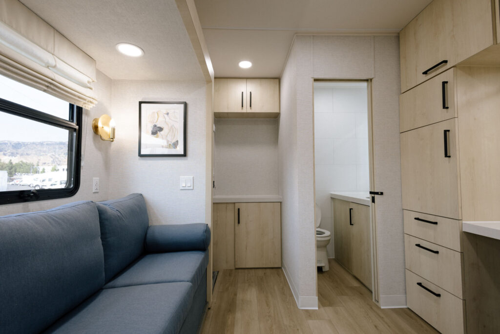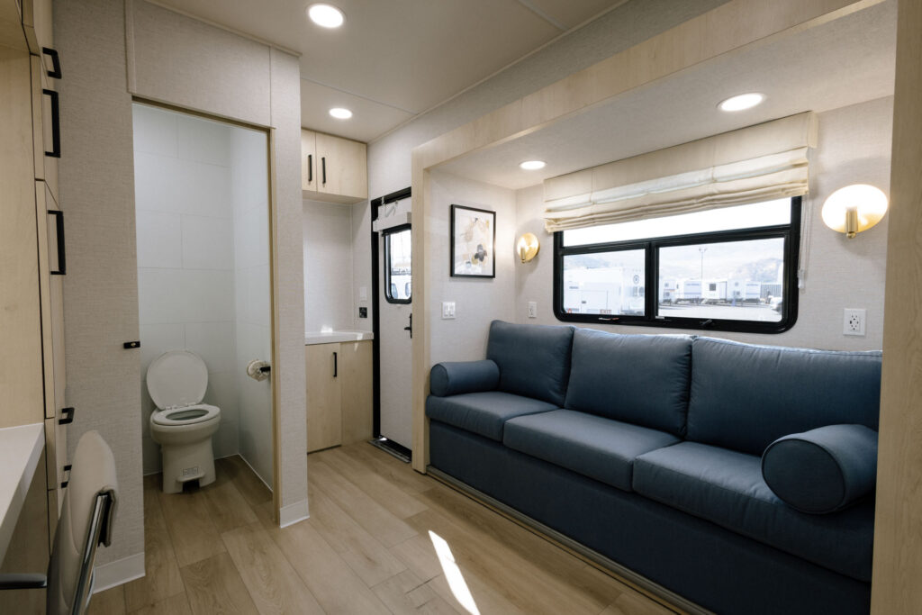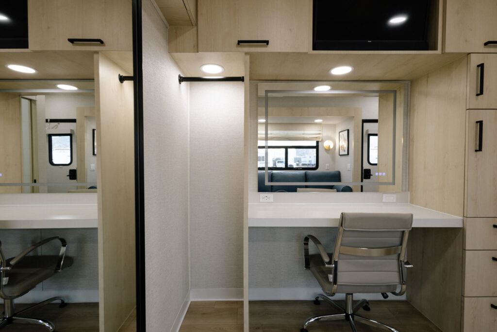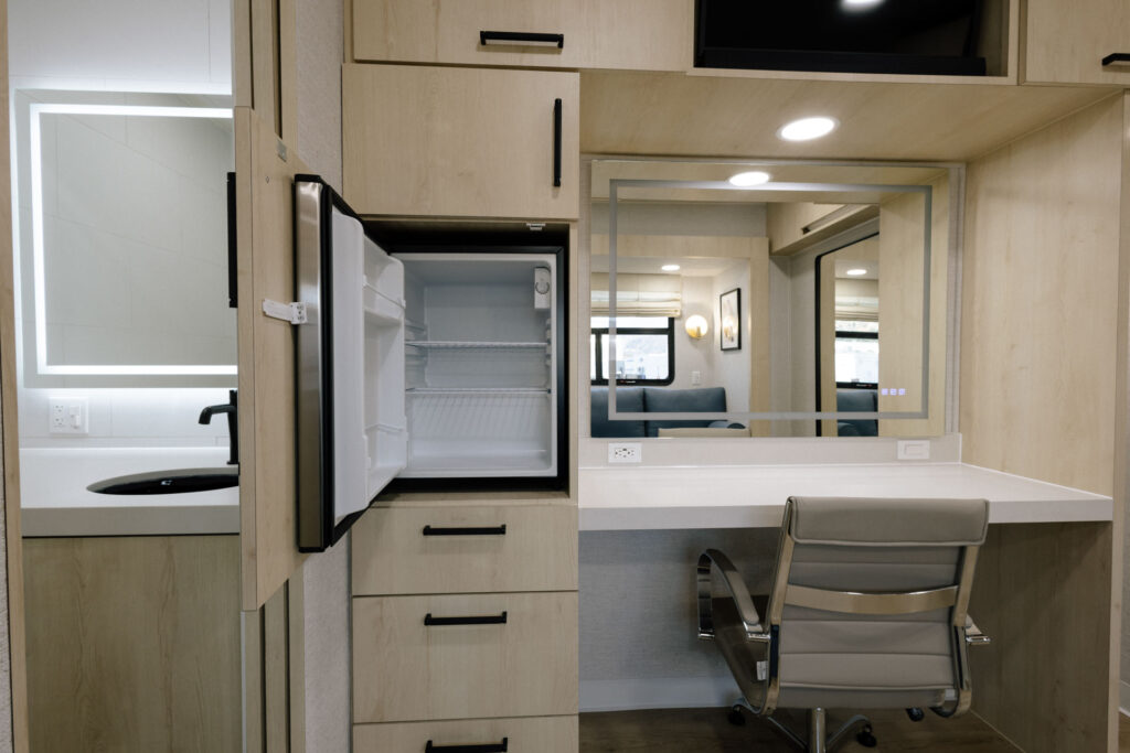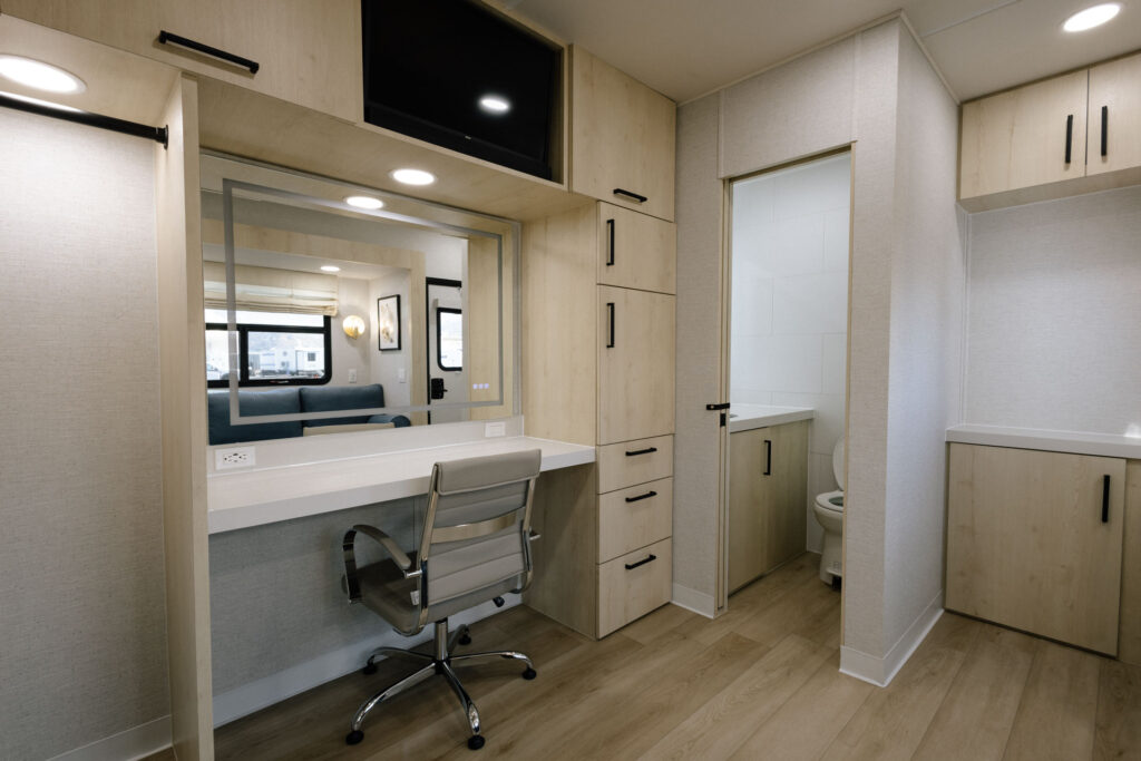 The iconic brand known for providing luxury cast trailers to celebrities and production clients is back with a fully remodeled trailer design. Revamped interiors feature a calming neutral palette, custom blonde mill work, and plush upholstery as well as a full-height refrigerator and electric fireplace. A refreshed exterior profile with smooth siding, features an updated logo, and modernized graphics that retain the brand’s signature stripes and retro-inspired typography.