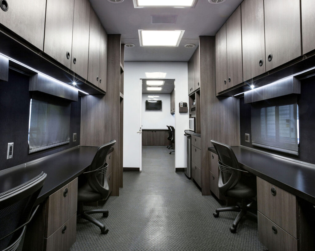 This 38ft production office makes the perfect place to organize the workday. The wide, well lit counters make excellent work stations with file drawers and overheard cabinets. Entry doors at each end of the trailer make it possible to access two rooms then the partition is closed in the center. For additional convenience a microwave, CD stereo, TV and DVD player are also built in.