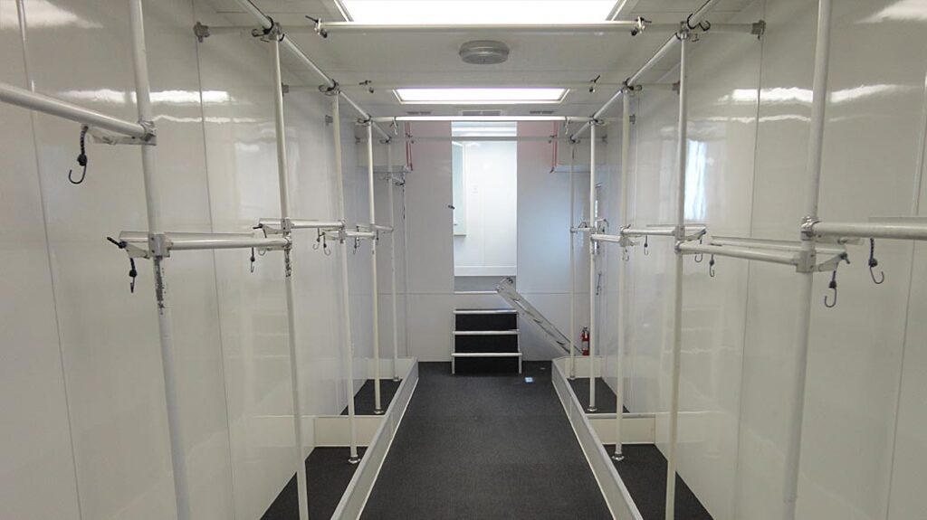This two level wardrobe trailer is double racked on sides for a total of 135ft of rack space. There are lots of drawers, overhead storage areas and floor containment divisions. In addition to more drawers and over head storage, the upper level is a fitting room with a lockable closet, a fold-up sewing table,a three way full-length mirror and a desk.