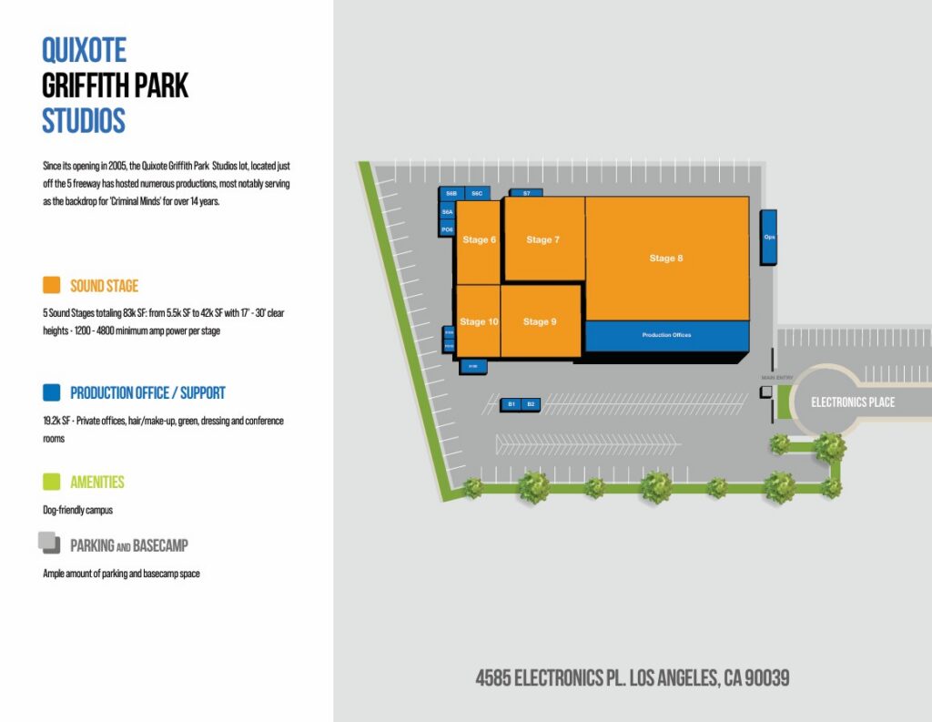 Conveniently located at the intersection of Interstate 5 and the 134 freeways, Quixote Griffith Park is a full-service lot including production offices, support spaces and generous parking / basecamp.